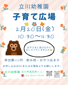 お知らせ日:2026.2.6 2月20日(金)10:30~11:30 お子さまと一緒に安心して楽しい時間を過ごしましょう。 お気軽に遊びに来てください😊 時間内の出入りは自由です。 お申し込みはHPまたはお電話よりお願いいたします。