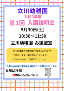 お知らせ日:2026.4.6 令和9年度 第1回目の説明会を開催 します。 立川幼稚園にご興味のある方、お気軽にご参加ください😊 園見学もございます。 お申し込みは、お電話またはHPからお願いいたします。